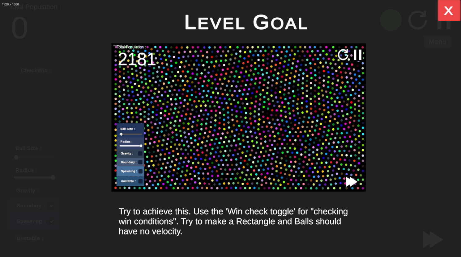 This is under construction. Please use those parameters and achieve the level goal (Only level one is Active).